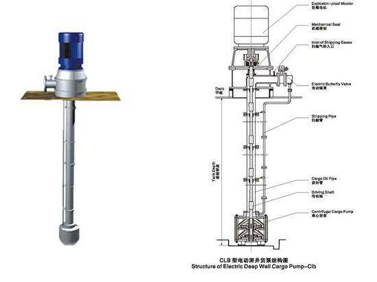 CLB型電動(dòng)深井貨泵由雙級(jí)離心泵、連接管及電機(jī)座,電機(jī)四大部件組成,電機(jī)座、電機(jī)安裝在甲板上,離心泵及連接管安裝在貨艙內(nèi),浸沒在貨物中,傳動(dòng)軸支承在滾動(dòng)軸承及特種塑料導(dǎo)軸承中,并通過彈性聯(lián)軸器與電機(jī)相聯(lián)接;傳動(dòng)軸的密 封采用機(jī)械密封結(jié)構(gòu),能適應(yīng)各種化工介質(zhì)的輸送要求。